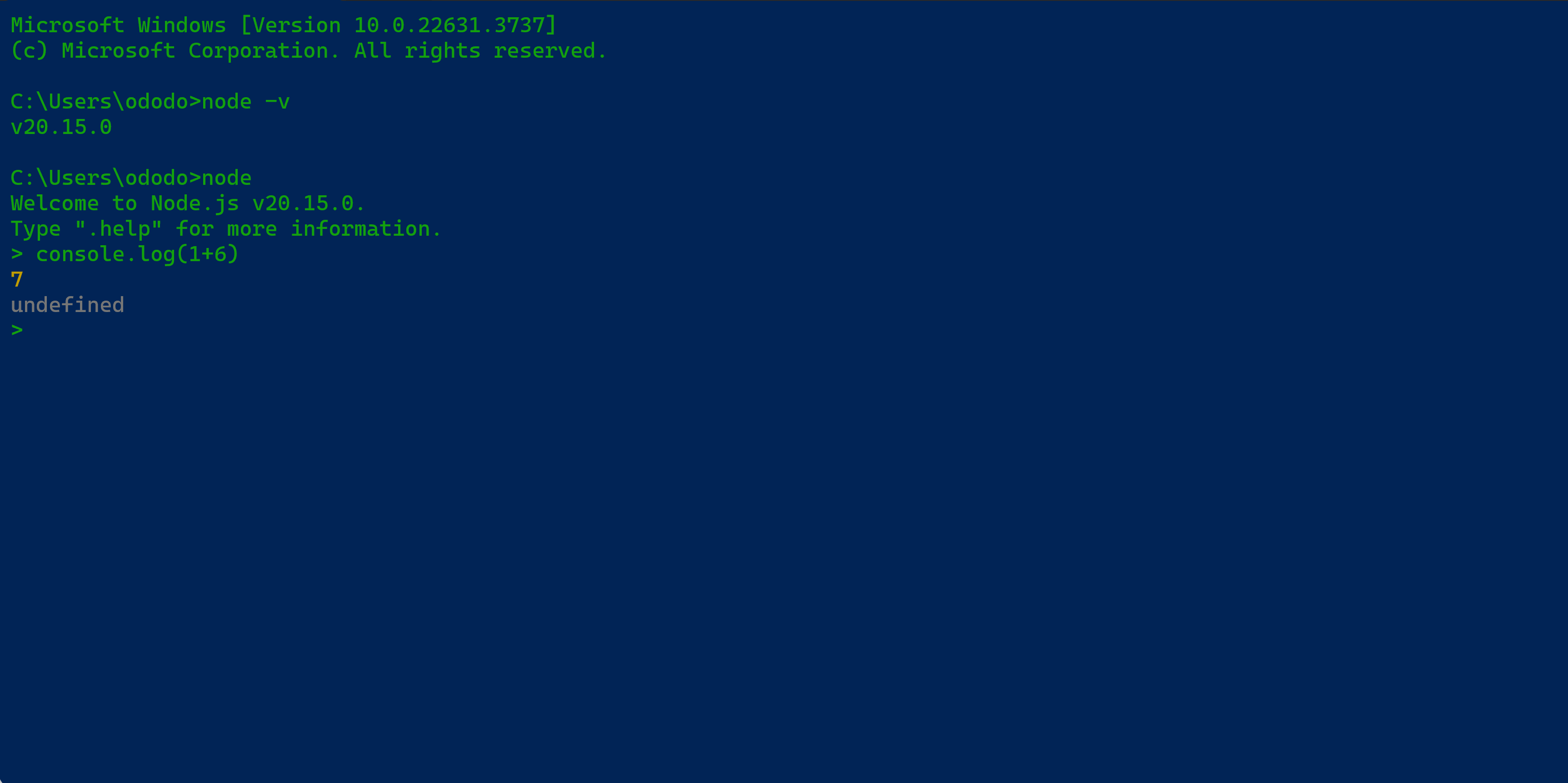 cmd로 폴더 경로 찾아가서 위 코드를 입력 했을 때 로그가 찍히면 아아아주 정상적으로 설치가 완료된 것이니 만족하고 본격적으로 노드js 공부하면 된다.
