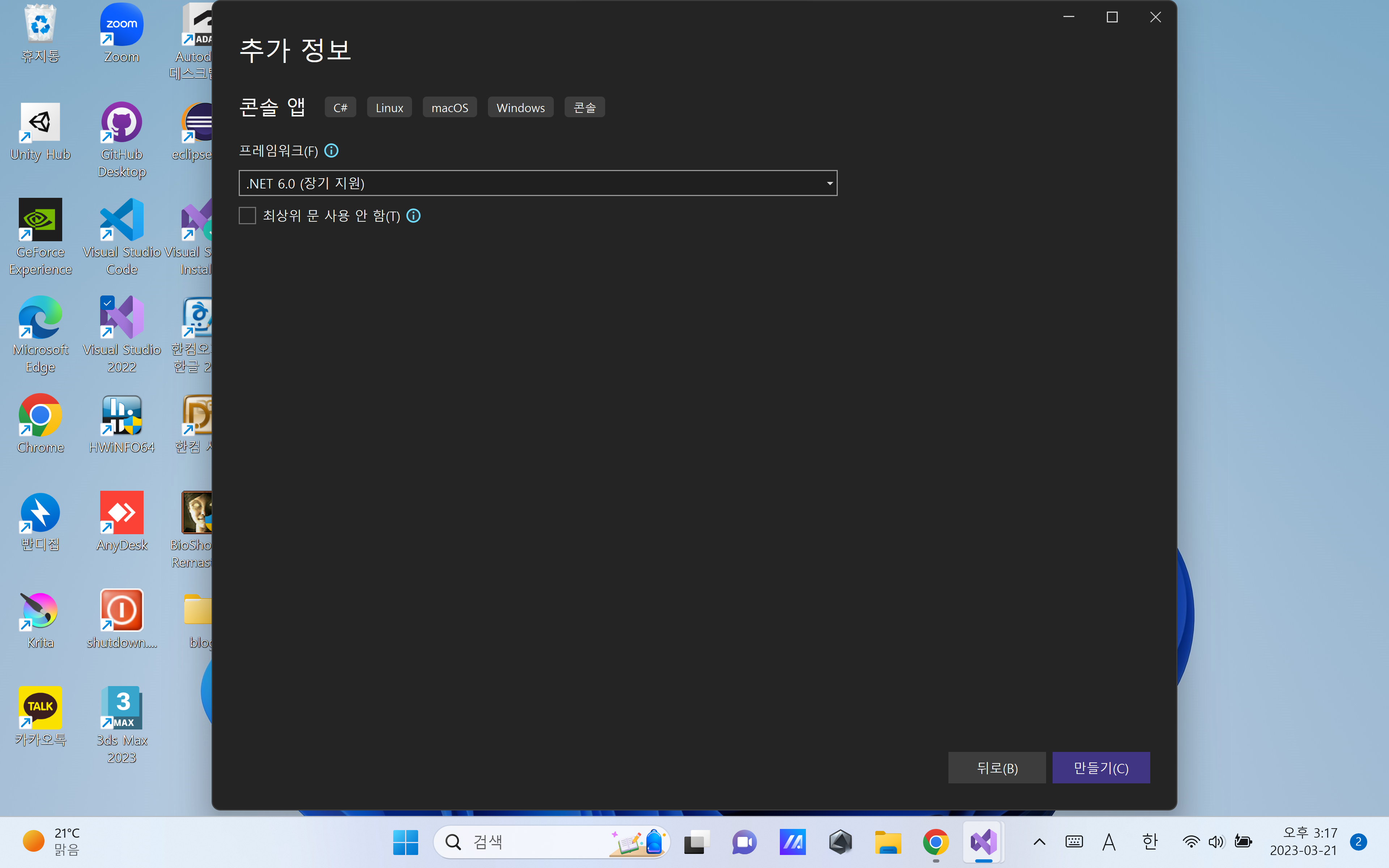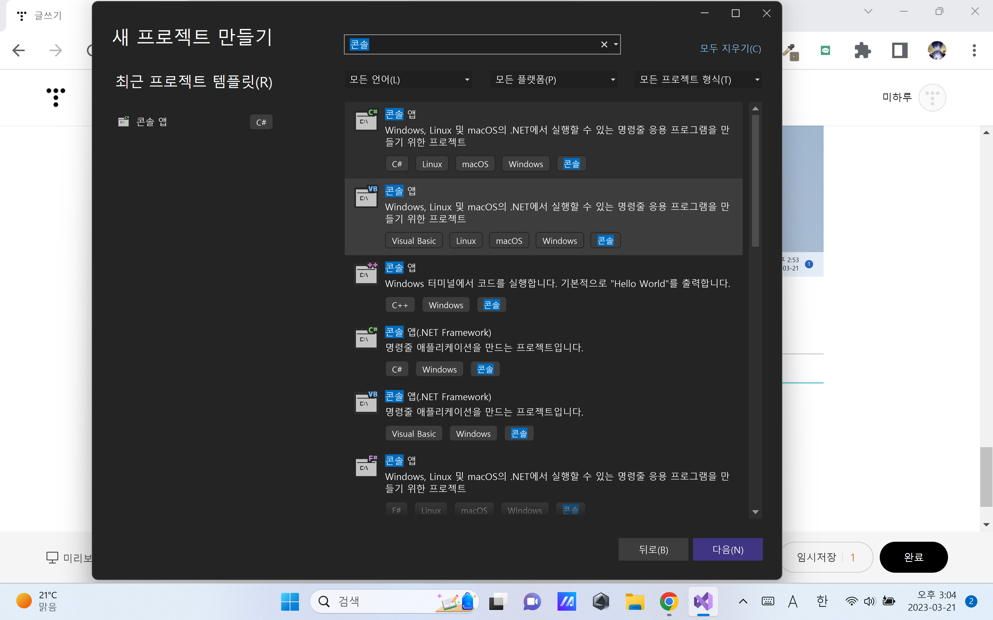 사진과 같은 화면이 나오면 검색창에 "콘솔" 이라고 검색하면 C#콘솔 앱 두 개가 뜰 것입니다. 그 중 (.NET Framework)가 붙어있지 않은 "콘솔 앱" 을 선택해 주시면 됩니다.