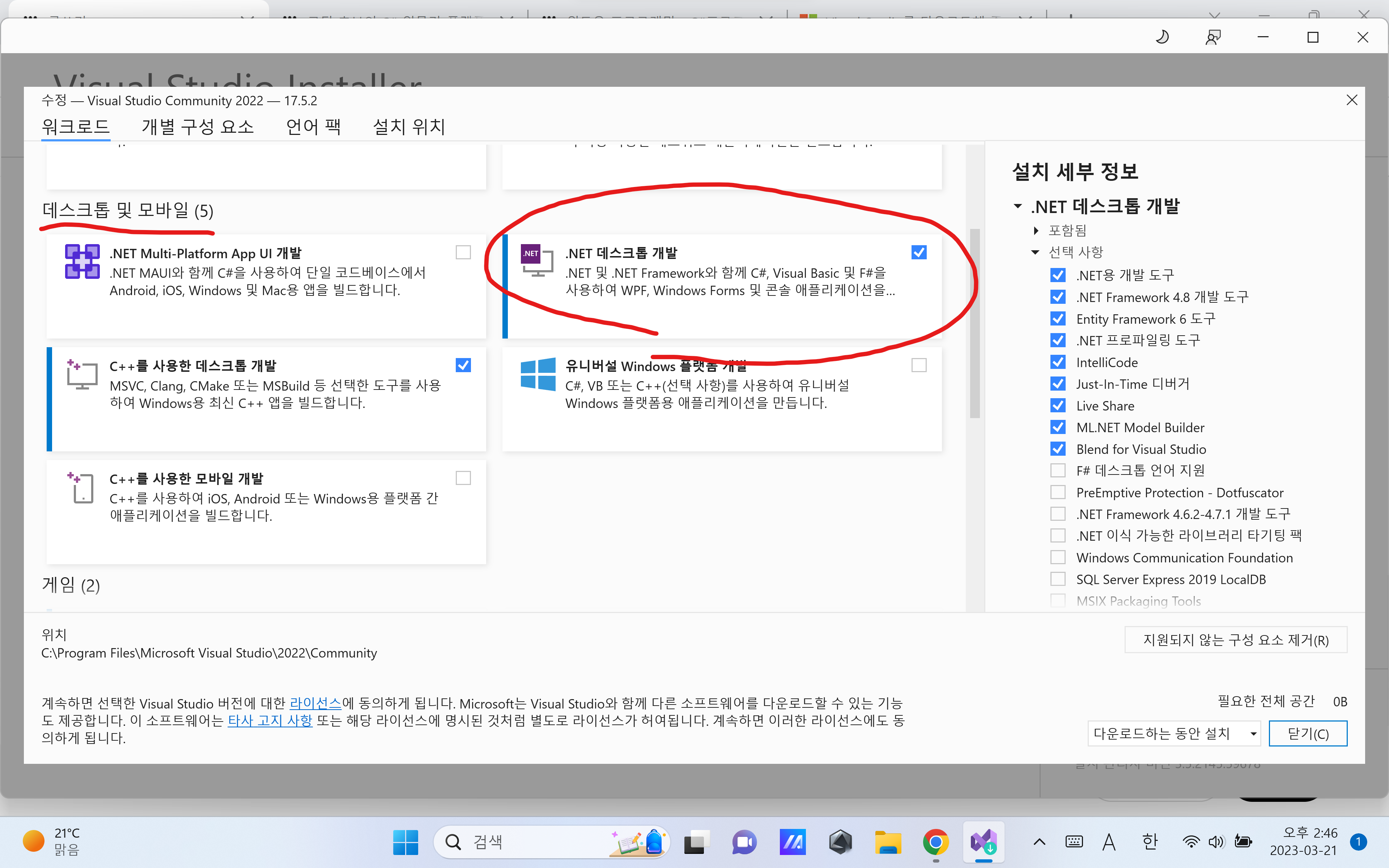 설치가 완료되면 사진과 같이 팩 설치 화면이 뜨는데 여기서 [데스크톱 및 모바일]-[NET 데스크톱 개발] 을 설치해 주시면 프로그램 설치는 끝입니다.