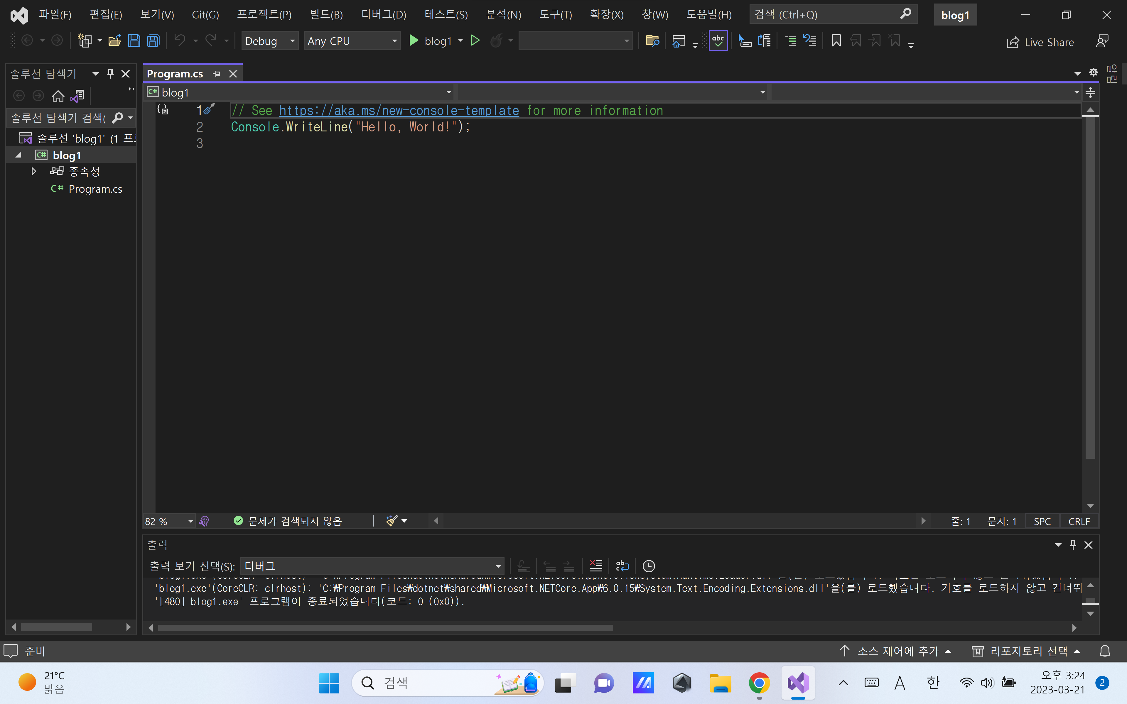 C:\Users\ododo\Desktop\blog\blog1\blog1\bin\Debug\net6.0\blog1.exe(프로세스 5768개)이(가) 종료되었습니다(코드: 0개).
