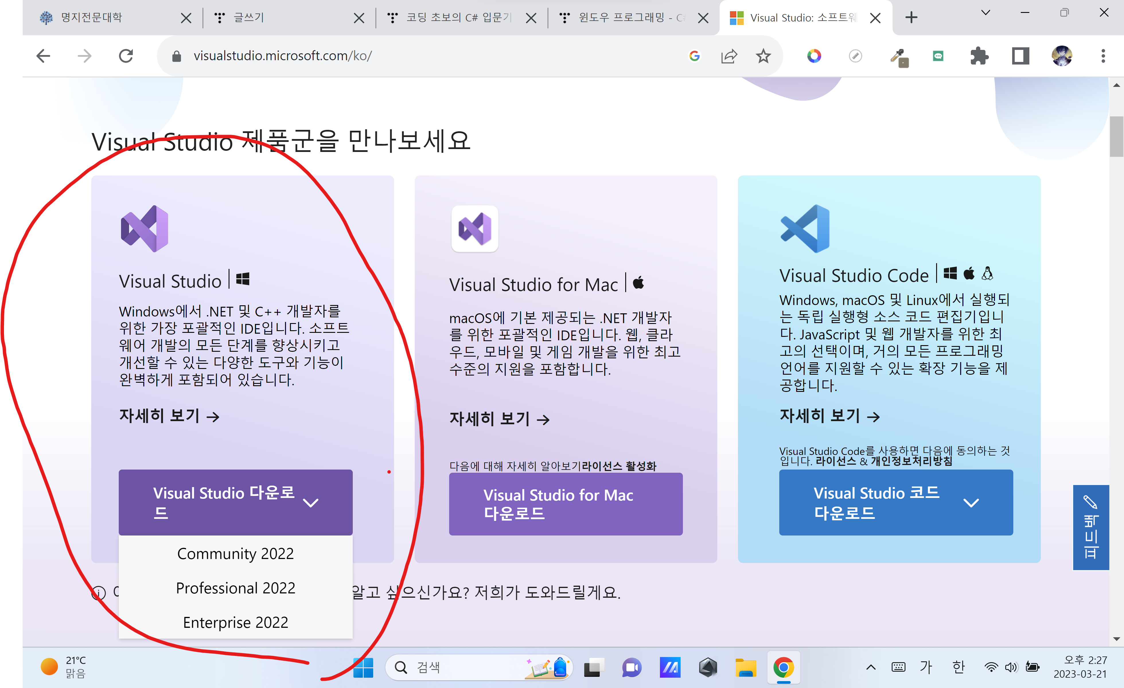 들어가서 이런 페이지가 나오면 세가지 중 왼쪽 Visual Studio 다운로드에 마우스 커서를 올리면 사진과 같이 Community, Professional, Enterprise 뜨면 Community를 선택해서 다운 받아 설치해 줍니다.
